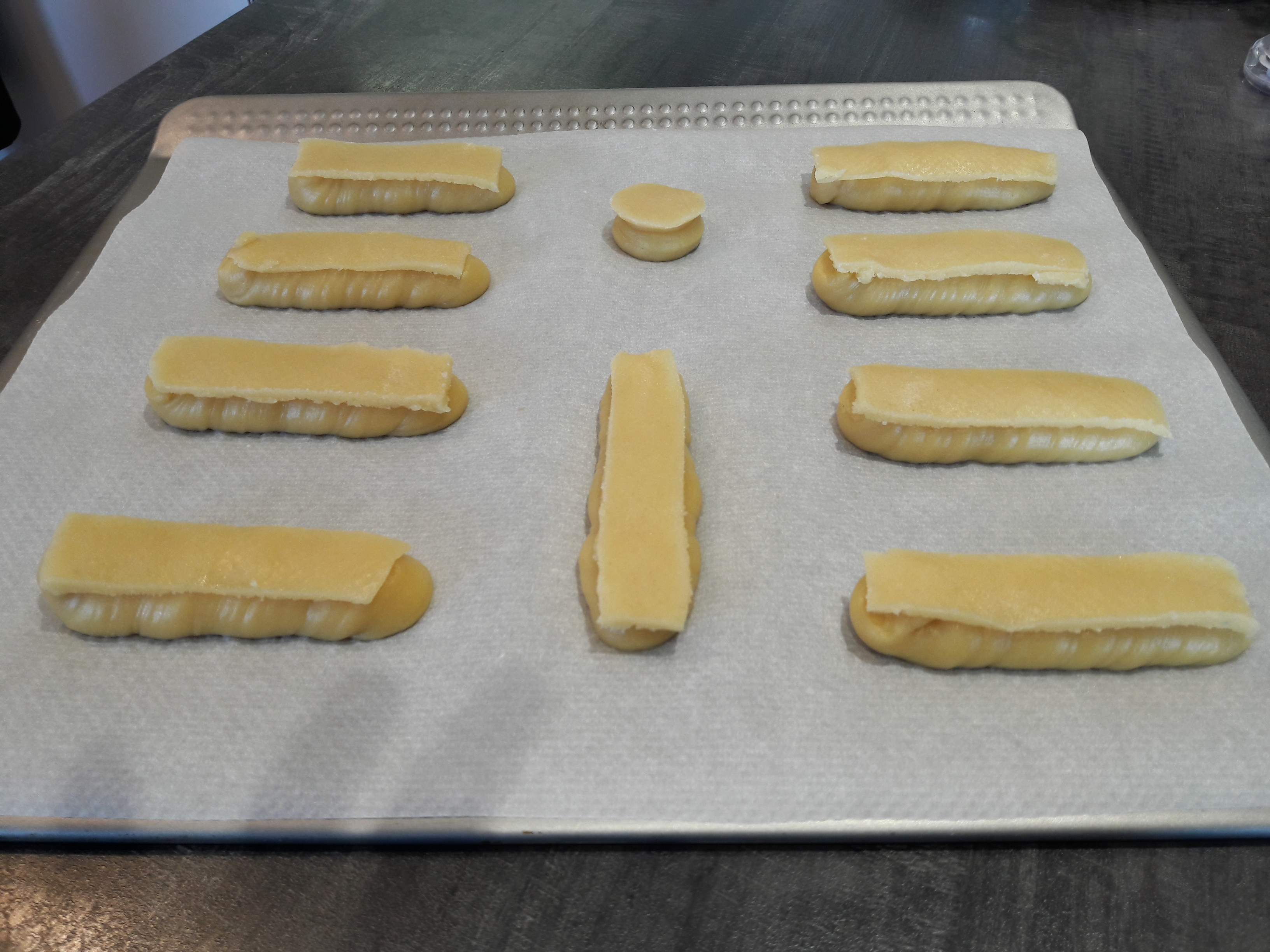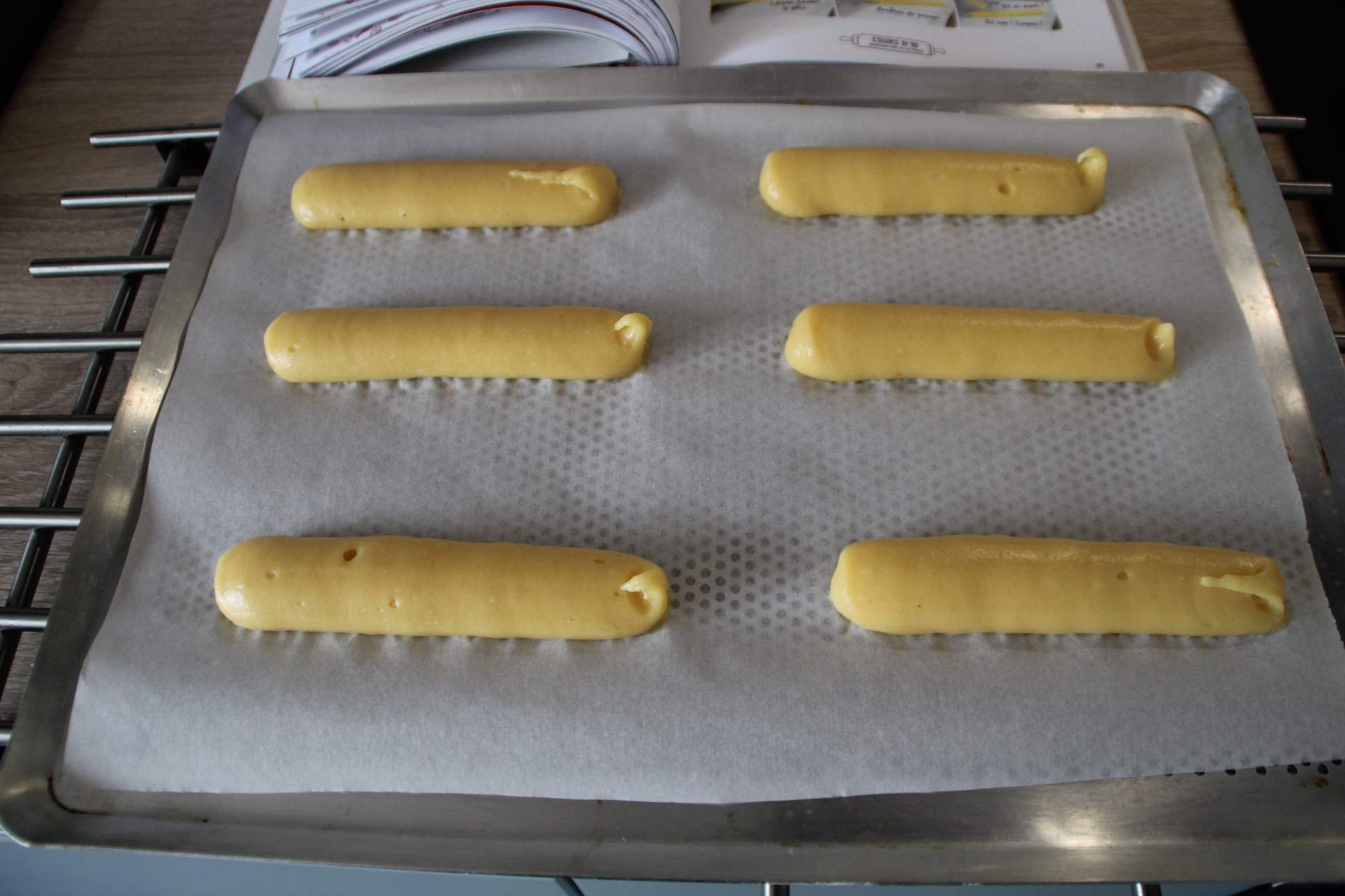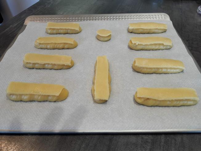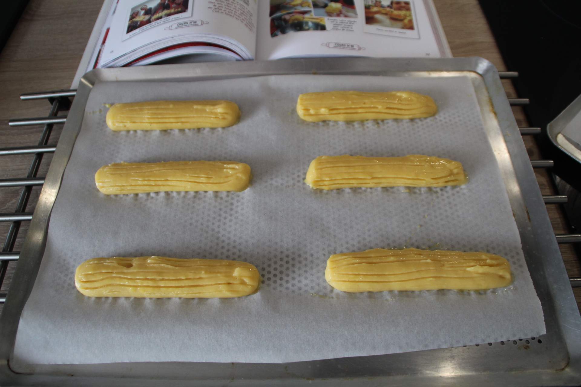 125g d'eau 50 gr de beurre 2.5 g de sel 100 gr d'oeuf (2) Réaliser une panade en mettant l'eau et le beurre à bouillir. Hors du feu incorporer en une fois la farine Melanger et dessecher la pâte si besoin sur le feu Ajouter les oeufs 1 par 1 Pocher 1.5 cm de large sur 13 cm dorer à l'oeuf Rayer à la fourchette enfourner 40 min Glacer.... Attention ne pas prendre de glaçage: _______________mais du fondant: