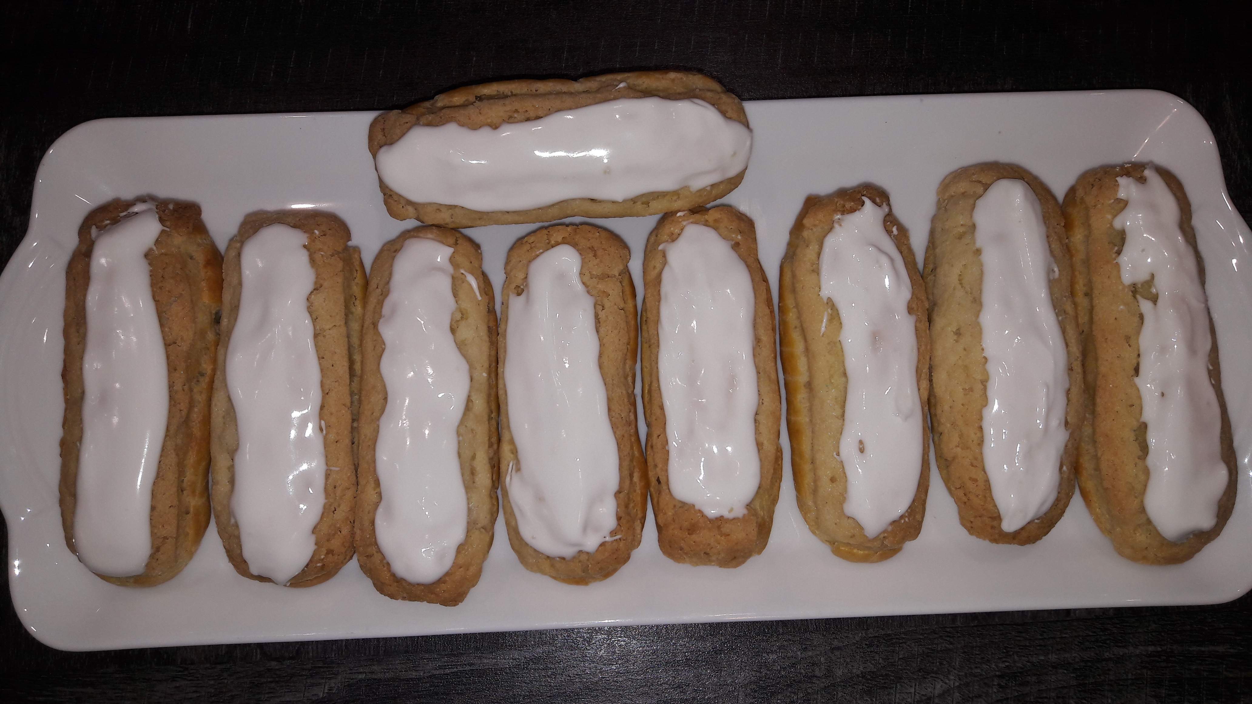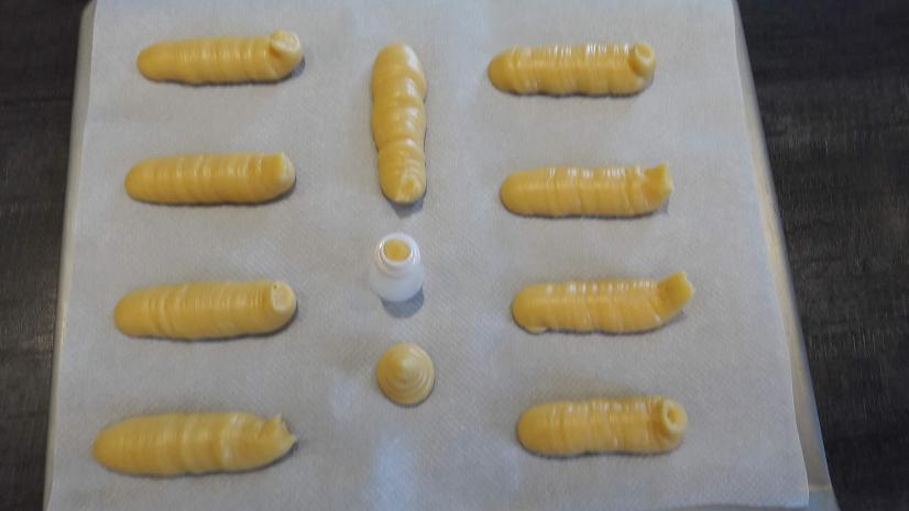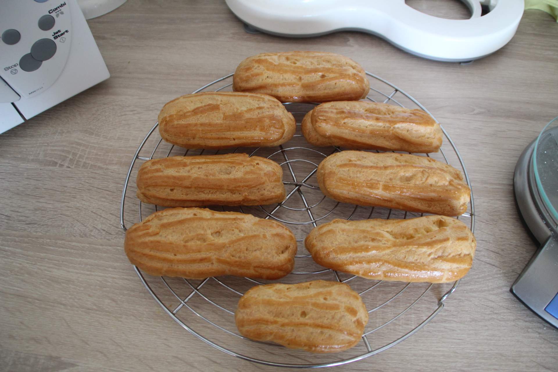 125g d'eau 50 gr de beurre 2.5 g de sel 100 gr d'oeuf (2) Réaliser une panade en mettant l'eau et le beurre à bouillir. Hors du feu incorporer en une fois la farine Melanger et dessecher la pâte si besoin sur le feu Ajouter les oeufs 1 par 1 Pocher 1.5 cm de large sur 13 cm dorer à l'oeuf Rayer à la fourchette enfourner 40 min Glacer.... Attention ne pas prendre de glaçage: _______________mais du fondant: