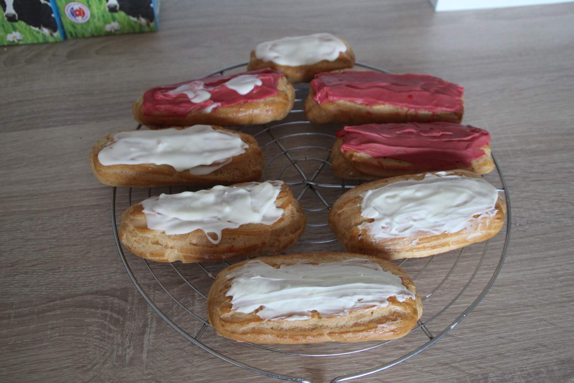 1 sachet de glacage 250g ne suffit pas Le colorant en poudre ne colore pas il faut du colorant liquide Mousse à la fraise sur base de 200 gr de coulis pour 8 eclairs Premier essai au craquelin
