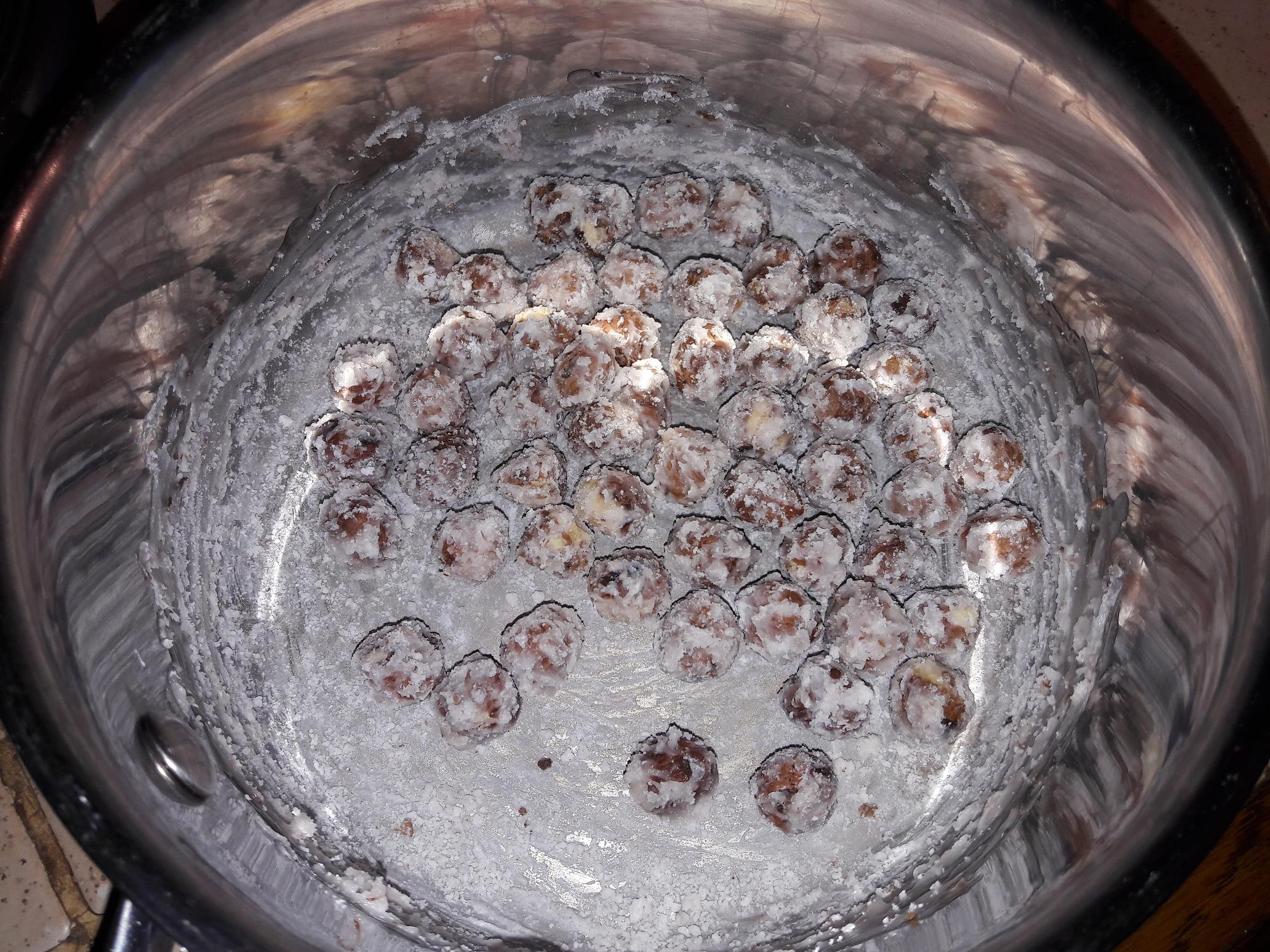 55g de noisettes Dans une petite casserole, cuire le sucre avec l’eau à 121°C, ajoutez les noisettes hors du feu et mélangez jusqu’à ce que le sucre recristallise: Saupoudrez le pourtour du moelleux avec une du sucre neige (2/3 sucre glace, 1/3 fécule de maïs). Détendre un peu le caramel, le pocher avec une petite douille unie en spirale. Déposez les noisettes sablées autour.