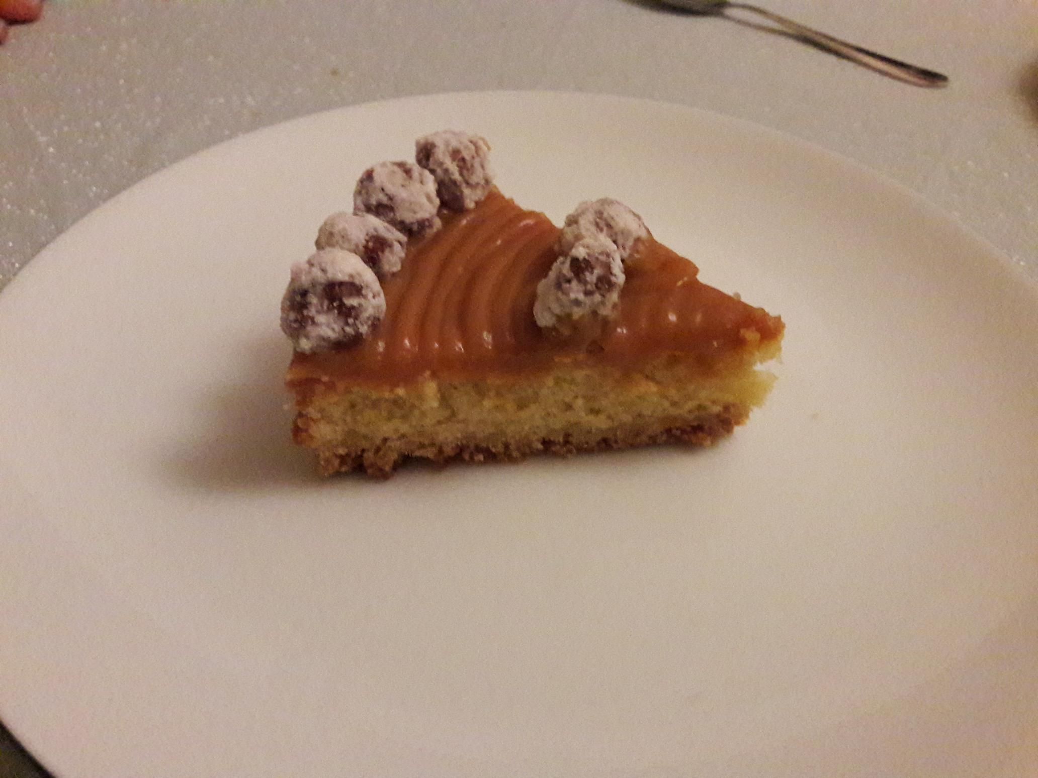Recette pour une tarte de 8 personnes, cercle de 16cm. 53g de sucre Réalisez un caramel blond avec le sucre, et un peu d'eau Ajouter la crème préalablement chauffée Ajoutez le beurre, la vanille et le sel.. Mettez dans une poche à douille Essayer de le faire un peu plus ferme