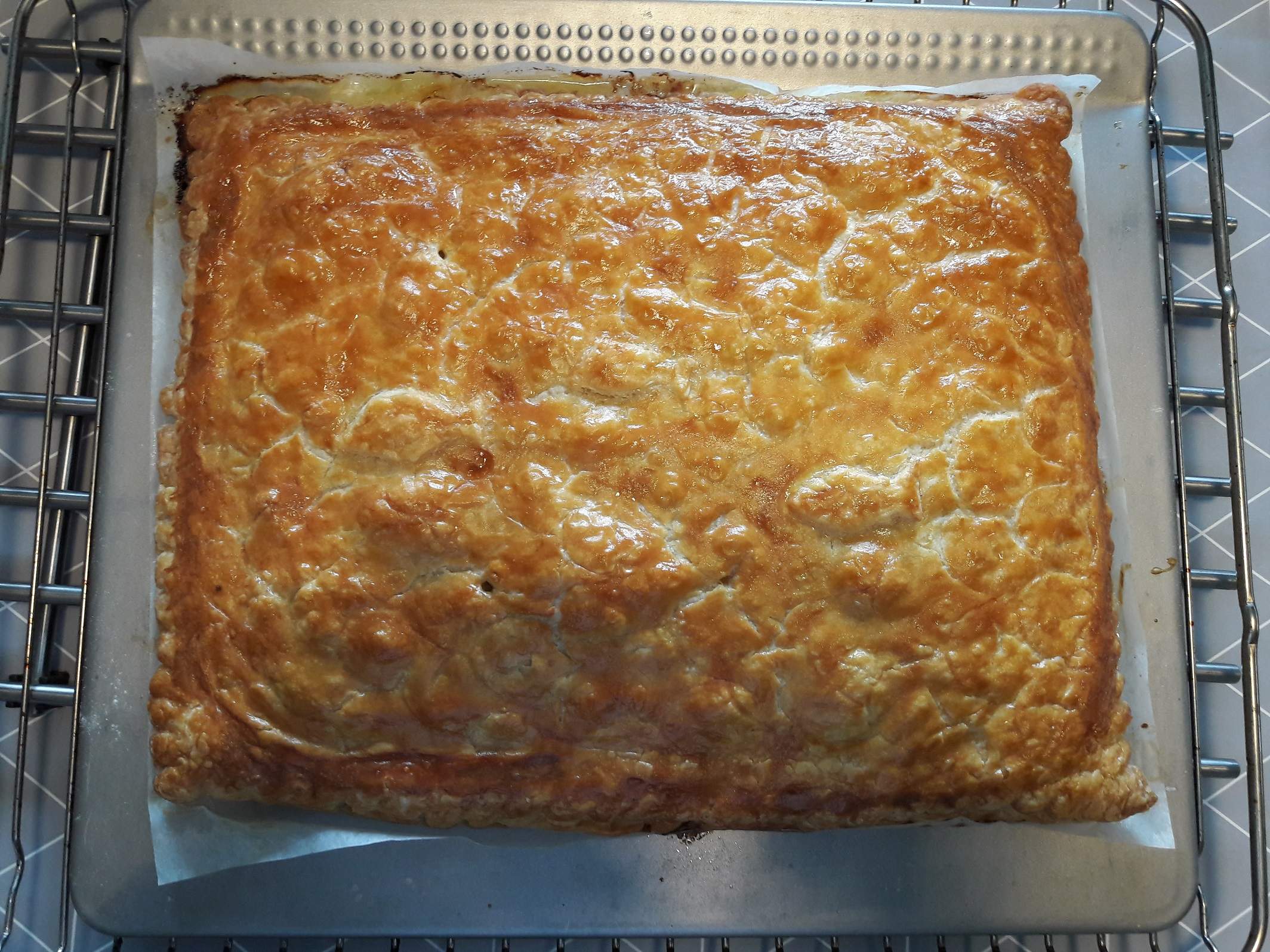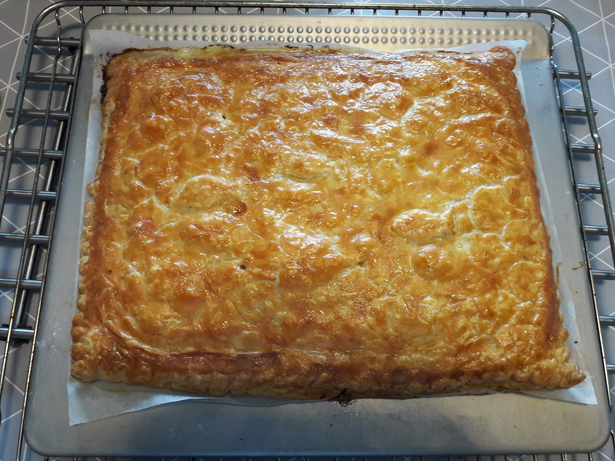 Rajouter la deuxieme couche de pâte feuillettée coller et l'eau et chiquet la pâte Dorer à l'oeuf et faire reposer 20 minutes Scarifier et re-dorer à l'oeuf Cuire.....