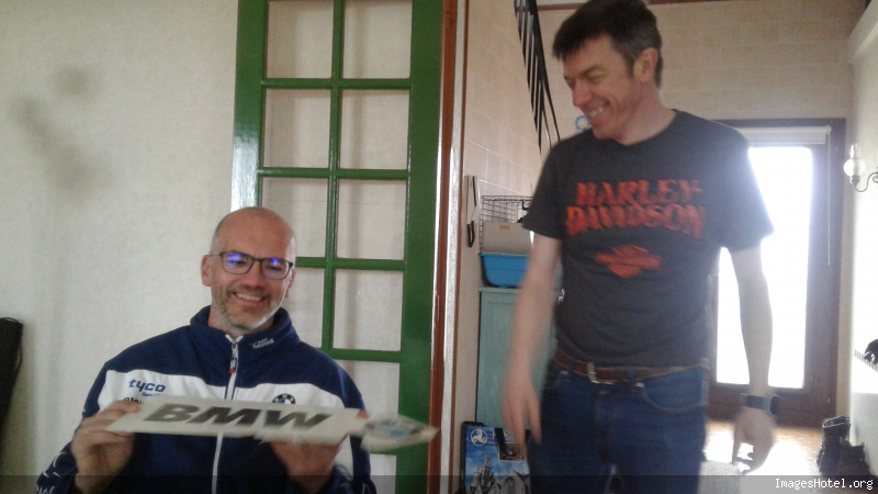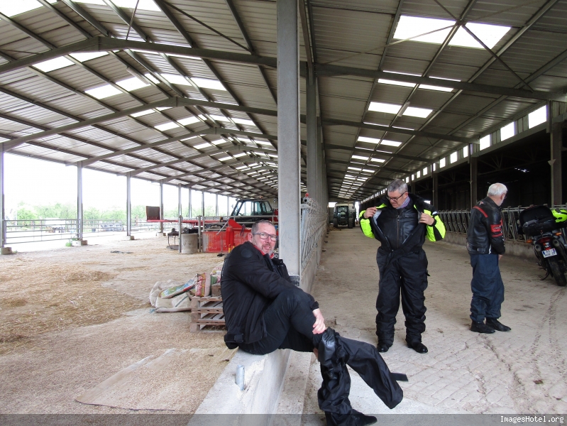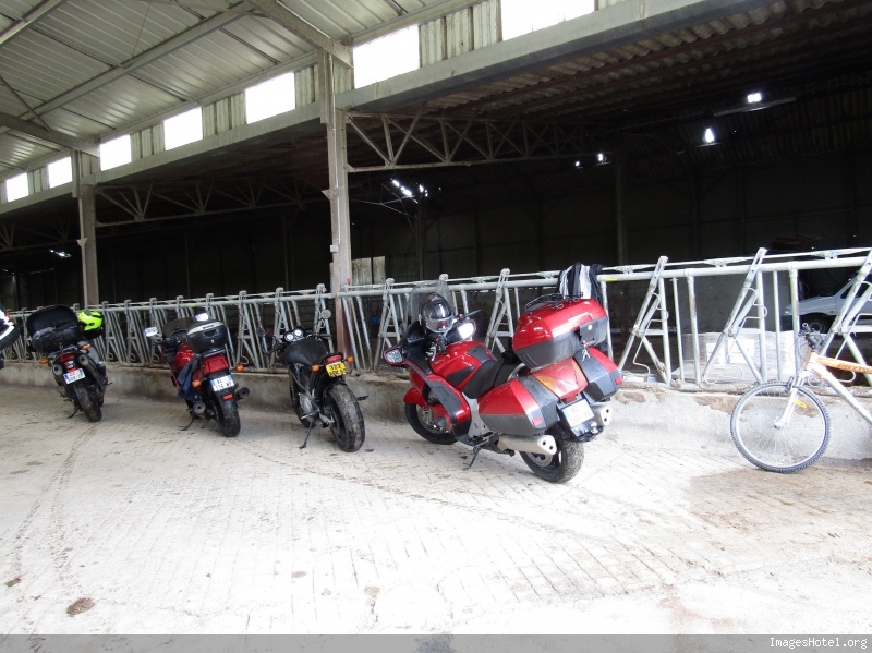 Arrivée à l'auberge. Le patron nous propose gentiment de mettre les motos à l'abri dans la stabulation.