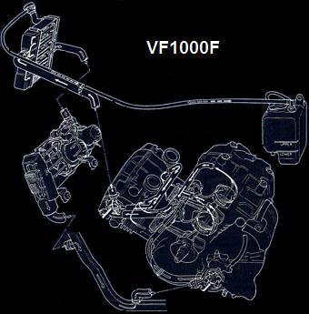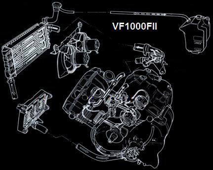 Circuit de refroidissement différent. Le deuxième radiateur est dans la tête de fourche sur la F, dans le sabot moteur sur le FII (montage type VF750F). La position du thermostat est aussi différente, à gauche sur la F, à droite sur la FII. Allongement de la démultiplication primaire (1,889 contre 1,971 sur la VFF). Arbres à cames différents. Radiateur d'huile sur la FII, pas sur la FG (5 Kg d'écart). La presse de l'époque avait annoncé une réduction du diamètre des carburateurs, annoncant 33 mm, pour "réduire la consommation". Mais les carburateurs de la FII font bien 36 mm, comme ceux de la VFF. |