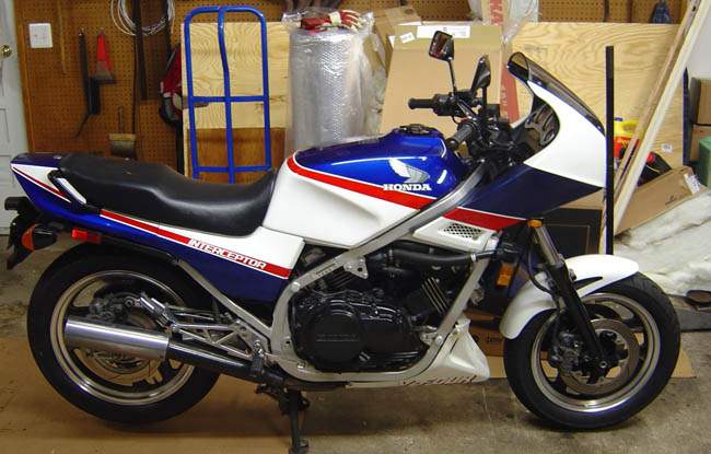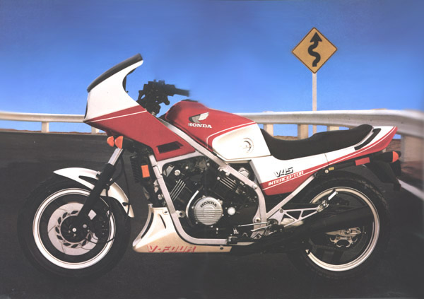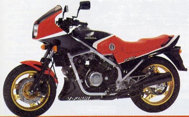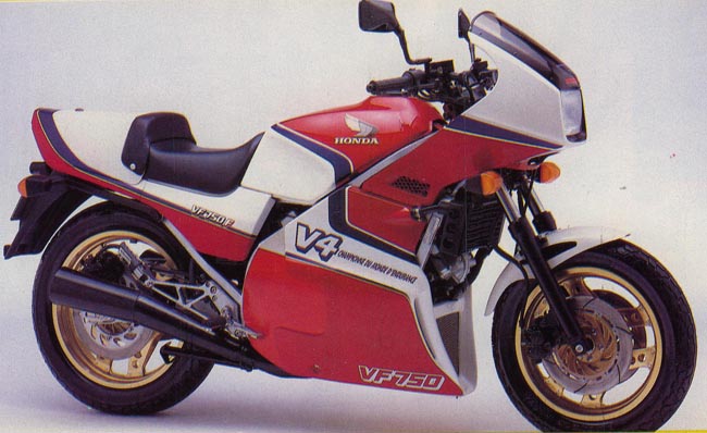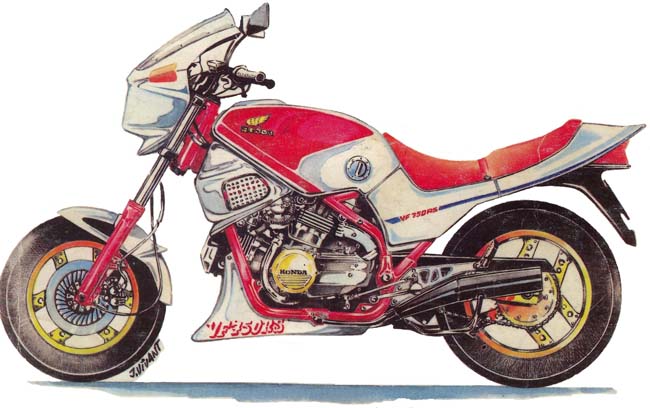 After the VFS, Honda had presented in 1983 a sport V4, the VFF. Drawings in magazines before the official launch: This drawing was probably oriented by Honda, as the designer find directly the good shape (and color) for the wheels, the design of the brakes disks, the front fairing is the VF400F one (not launch at this moment)... Two colours in France, the blue : And the red : In 1984, a black version : After 1985, the bikes were sold with a lower fairing and a 'dosseret de selle' : These fairing were produce by Pichler: US bikes with differents stikers, other wheels.... :